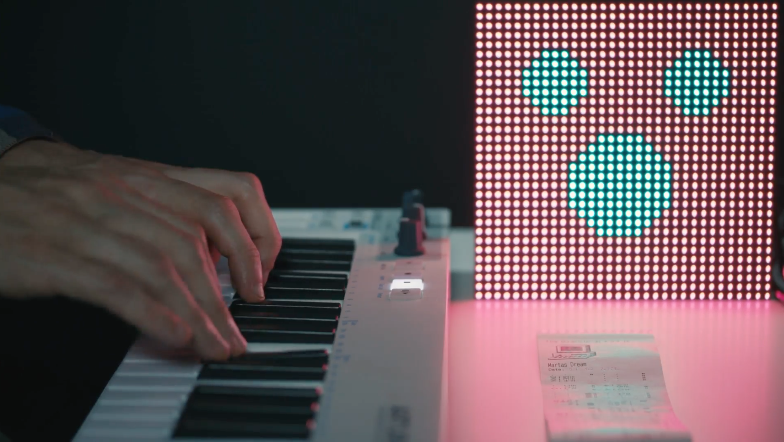 The Tiny Chronicler is a musical instrument created by Marta Forsberg and Andreas Dzialocha, which listens to stories and converts them into musical scores through AI.
